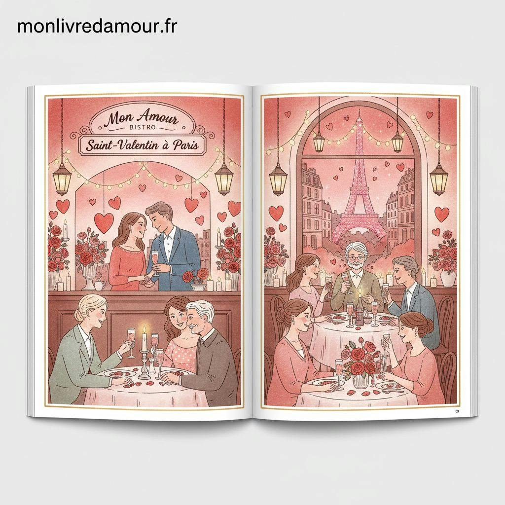 Imaginez un couple, Marie et Julien, qui célèbrent leur première Saint-Valentin ensemble. Julien sait que Marie adore la cuisine italienne, alors il réserve une table dans un restaurant italien pittoresque à Montmartre. Ils arrivent tôt pour profiter d'une promenade romantique dans le quartier avant le dîner. Pendant le repas, Julien surprend Marie avec une lettre d'amour qu'il a écrite. Cette attention transforme leur soirée en un souvenir qu'ils chériront toujours.